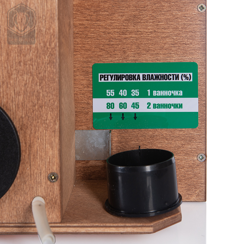 Механическая регулировка влажности заслонкой. Регулирование влажности происходит за счет избыточного воздухообмена. При «закрытой» заслонке просвет вентиляционного отверстия минимален и обеспечивается 5-кратный воздухообмен (почти 300 литров в час). Для снижения уровня влажности заслонка открывается, и в инкубатор подается в разы больше воздуха, чем необходимо. За счет такого избыточного вентилирования достигается пониженный уровень влажности.