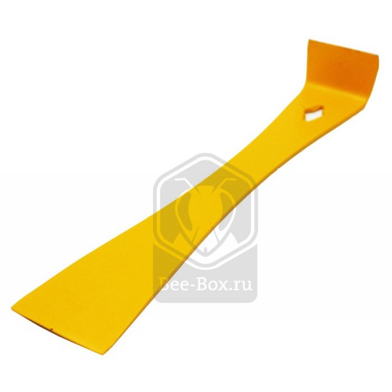 Стамеска-гвоздодёр, окрашенная в яркий жёлтый цвет. Такой инструмент сочетает в себе классичекую стамеску для пасеки и приспособление для выдёргивания небольших гвоздиков. Также, ей удобно счищать накопившийся на корпусах прополис. Данная конструкция зарекомендовала себя надёжностью, удобством и практичностью.