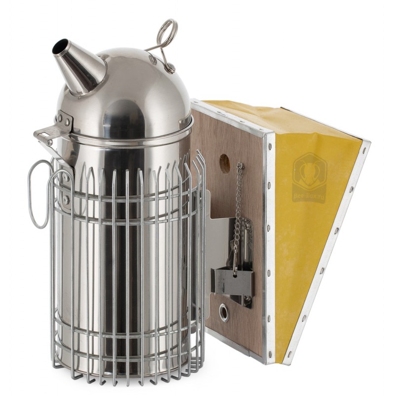 Материал дымаря - нержавеющая сталь. Меха - износостойкая искусственная кожа. Имеет защитную обрешетку с крюком. Решетка заходит под дно дымаря, что позволяет не задумываясь ставить его на крышу любого пеноулика. Функцию внутреннего стакана несет донная вставка.