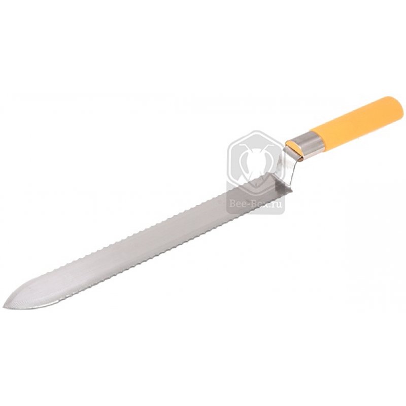 Нож из нержавеющей стали c пластиковой ручкой для снятия забруса при распечатывании сотов. Заточка двухсторонняя волнообразная. Длина лезвия - 285 см.
