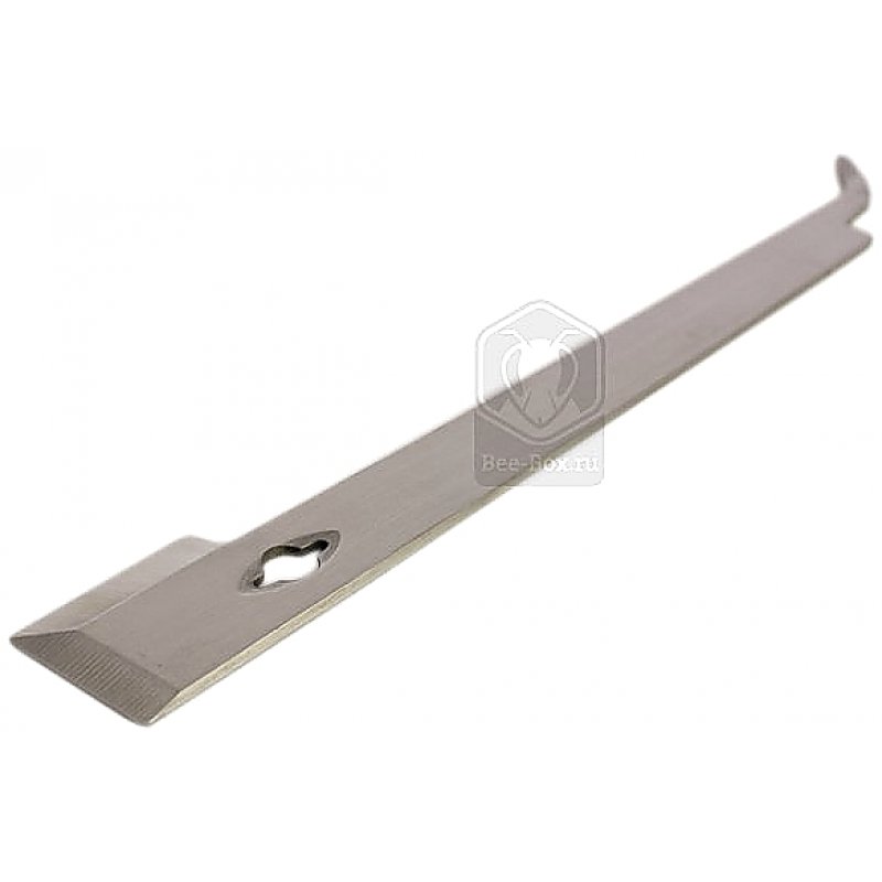 Стамеска J-типа из нержавеющей стали с двумя острыми гранями. Идеально подходит для работы с пенополистирольными ульями, т.к. позволяет поднимать запрополисованные рамки крюком, опираясь на соседние рамки и не повреждая стенки улья.