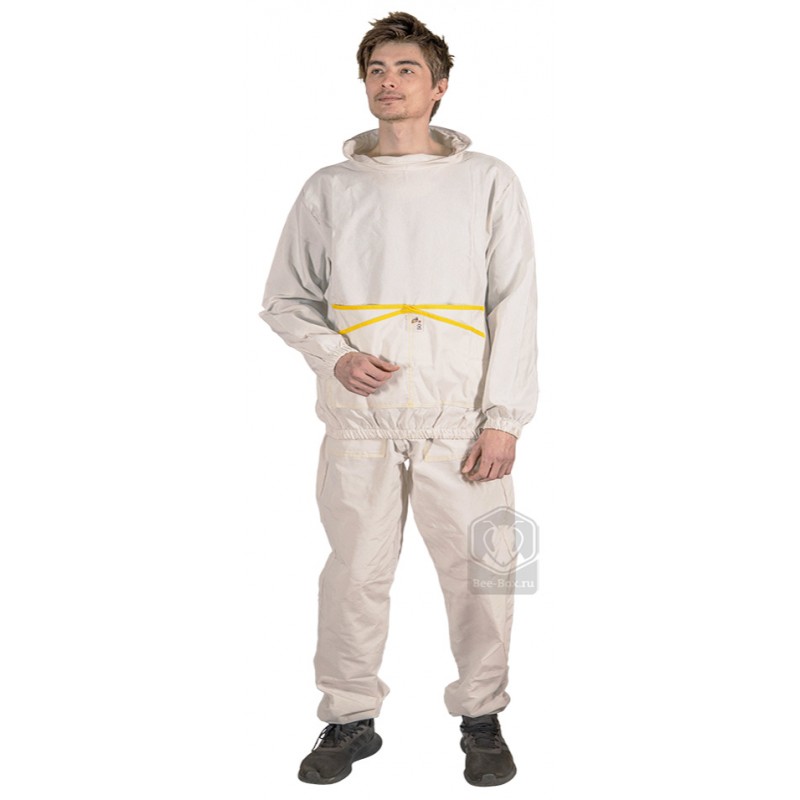 Плотная ткань двунитка. 80% хлопок, 20% полиэстер . В ворот вшито кольцо, которое позволяет использовать костюм с обычной защитной сеткой на резинке. Большие удобные карманы.