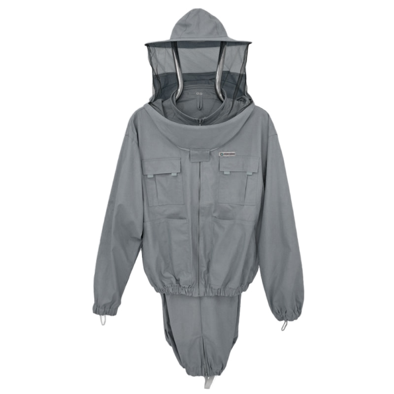 В комплект входят куртка с защитной лицевой сеткой, которая пристегивается двумя молниями, и брюки. Куртка на застежке молния, что обеспечивает удобное одевание. По низу куртки, в поясе брюк, а также в манжетах для рук и ног вшиты обтягивающие резинки. Также в манжеты рукавов вшиты резинки для пальцев. При работе рукава не задираются вверх. На куртке два кармана на уровне груди на липучке и четыре боковых кармана. Два накладных боковых кармана расположены на брюках. Один карман на правой брючине вдоль бокового шва. Такой карман удобен для инвентаря, в него можно положить стамеску, щетку и пр. В манжеты брюк вшиты резинки для удобной фиксации на ноге. Вдоль шва визу брючины вшита молния для удобства одевания.