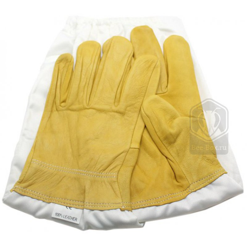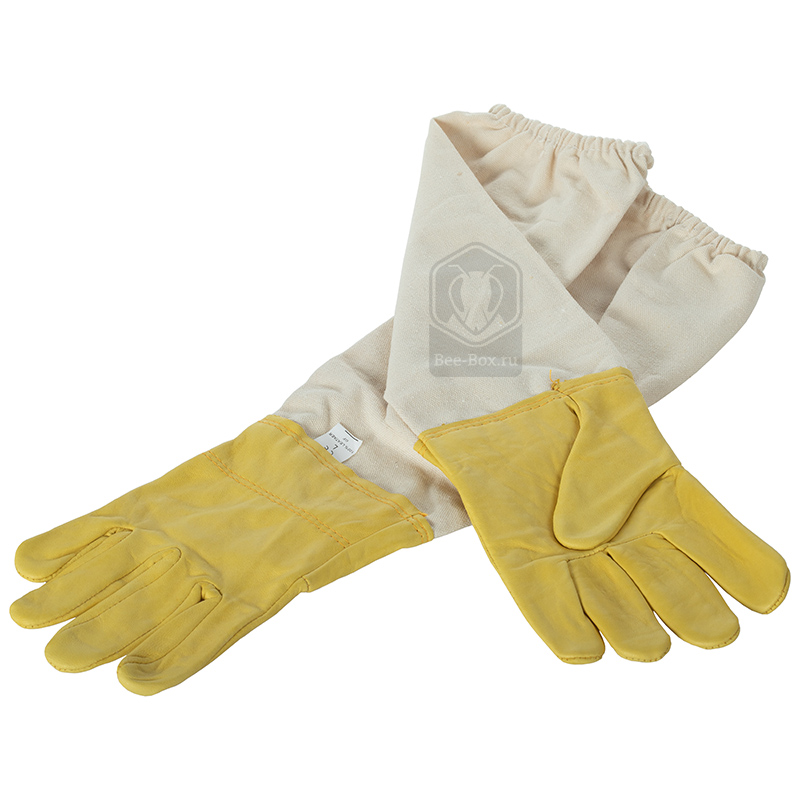 Перчатки изготовлены из натуральной кожи (Верхнего слоя кожи, полученного в результате слоения шкуры и окрашенного в желтый цвет. Достаточно толстого, чтобы пчела не могла его пробить, но тем не менее очень мягкого для комфортной работы.) и пришитых к ним двурядным швом нарукавников. В свободные концы нарукавников вставлены обтягивающие резинки, которые не дают пчёлам забраться под ткань.