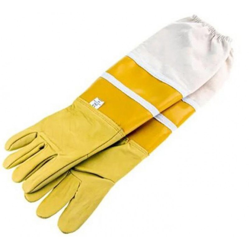 Перчатки изготовлены из натуральной кожи (Верхнего слоя кожи, полученного в результате слоения шкуры и окрашенного в желтый цвет. Достаточно толстого, чтобы пчела не могла его пробить, но тем не менее очень мягкого для комфортной работы). Между кожей и нарукавниками вставлена полоска из мягкой искусственной кожи для удобного вращения кисти. В свободные концы нарукавников вставлены обтягивающие резинки, которые не дают пчёлам забраться под ткань.