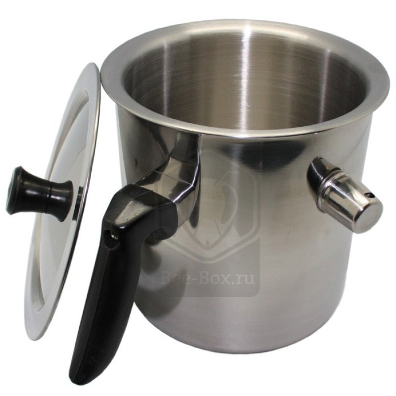 Эта емкость используется для того, чтобы растопить воск и разлить его по формам для свечей. Она имеет двойные стенки, между которыми заливается вода. Принцип водяной бани не позволяет воску дойти до кипения или пригореть. Емкость имеет контрольный свисток. Важно следить за наличием воды в междустенье.