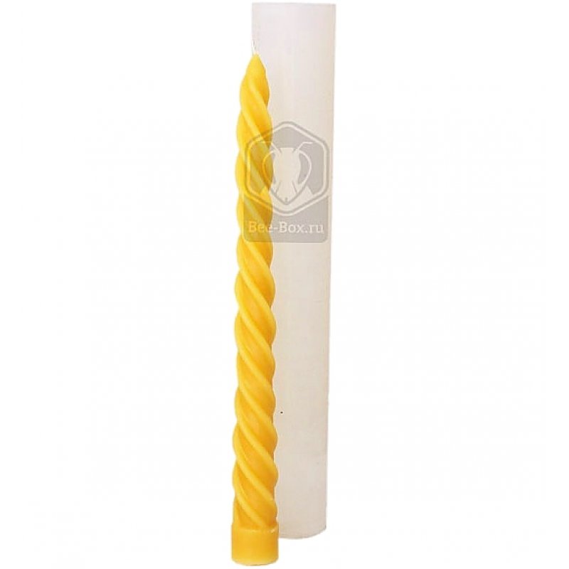 Форма для восковых свечей выполнена из пищевого силикона. Форма разрезана с одного края до центра для удобства установки фитиля и вынимания готовой свечи. Перед заполнением формы ее необходимо стянуть канцелярскими резинками или скотчем.