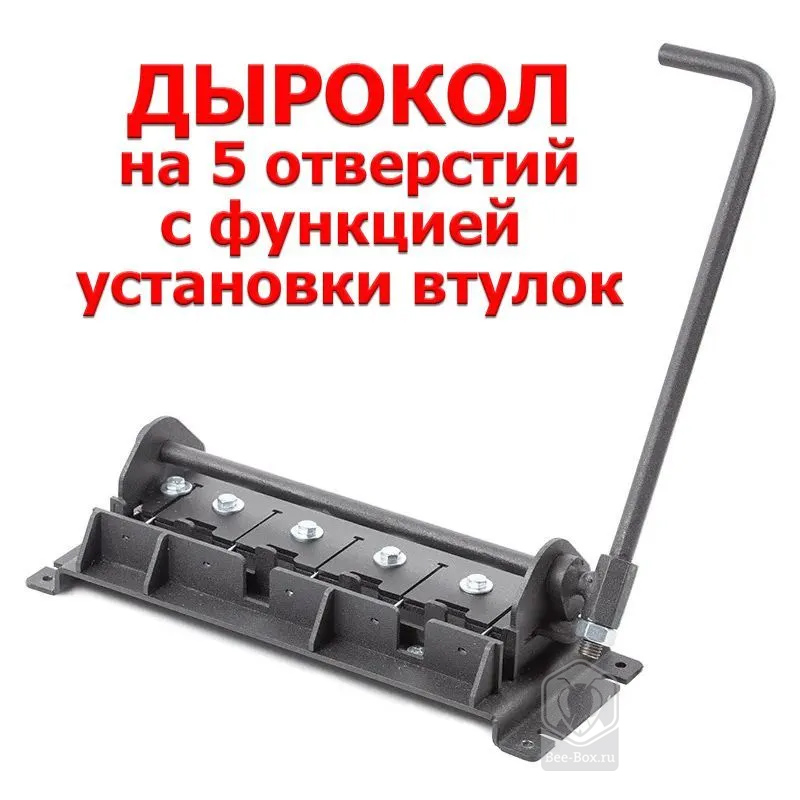 Дырокол на пять отверстий предназначен для одновременного прокалывания не более 5-ти отверстий в боковых планках всех типов рамок. Иглы представляют из себя обычные гвозди, которые легко вставлять/вынимать и их можно ставить разного диаметра. Есть возможность одновременной установки втулок. Ручка съемная.