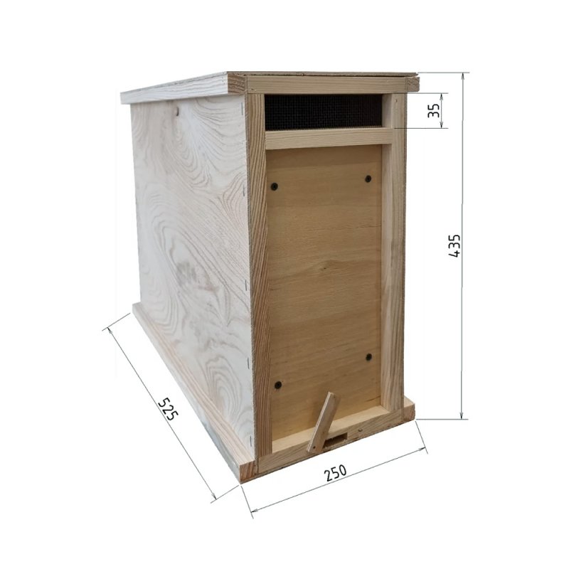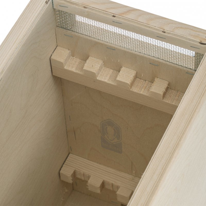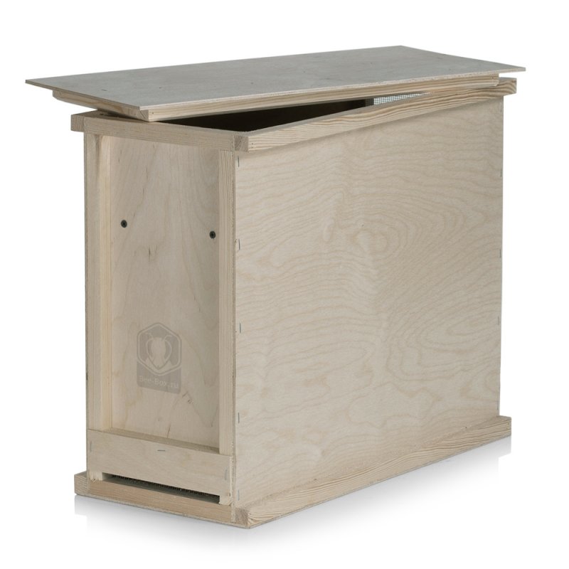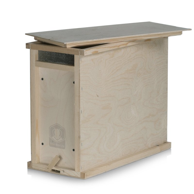 Это 4-х рамочный ящик из 4 мм фанеры с плотной крышкой, гребенкой для фиксации рамок и двухсторонней вентиляцией. Каркас изготовлен из деревянных реек 20×20 мм. Имеет закрываемый леток.