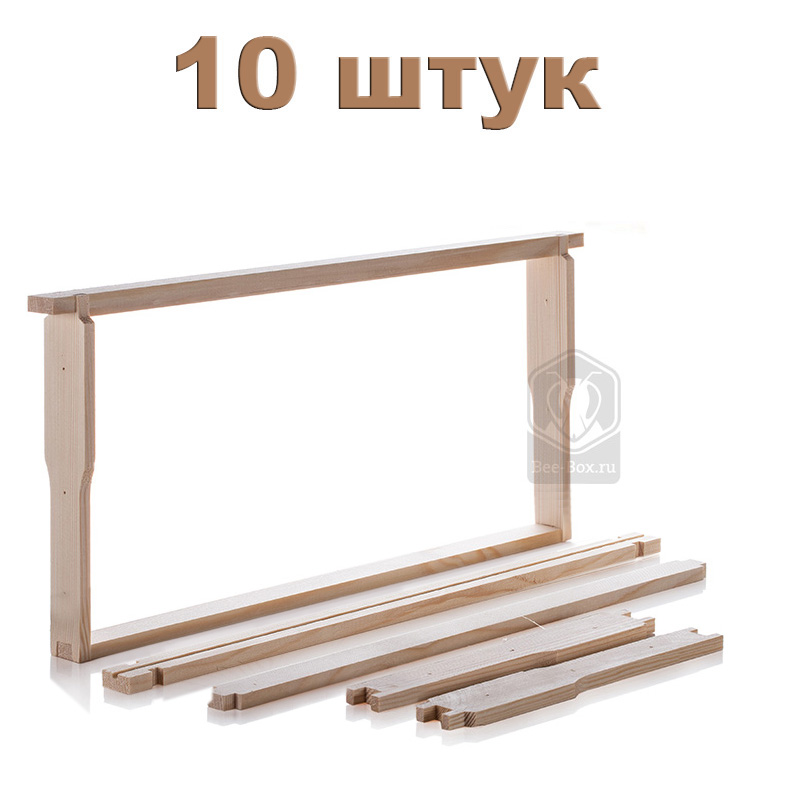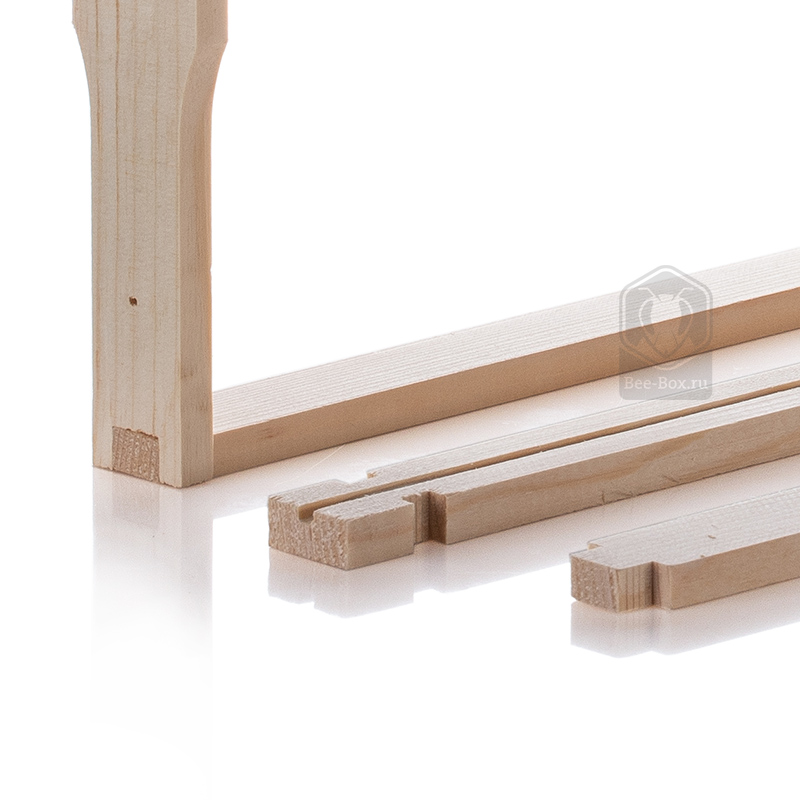 Рамки имеют паз под вощину в верхней планке. В боковых планках просверлены по три отверстия. Поставляются в разобранном виде.