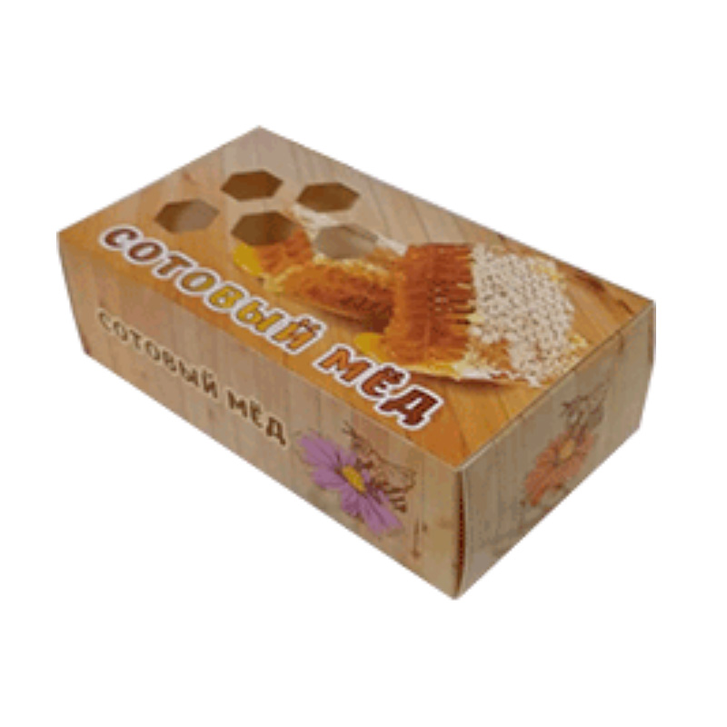 Коробка не имеет открытых окон, что защищает сотовый мед от воздействия солнечных лучей. На коробочках предусмотрено место, куда производитель меда может разместить информацию об изготовителе, массе продукта, сроке годности и т.д.