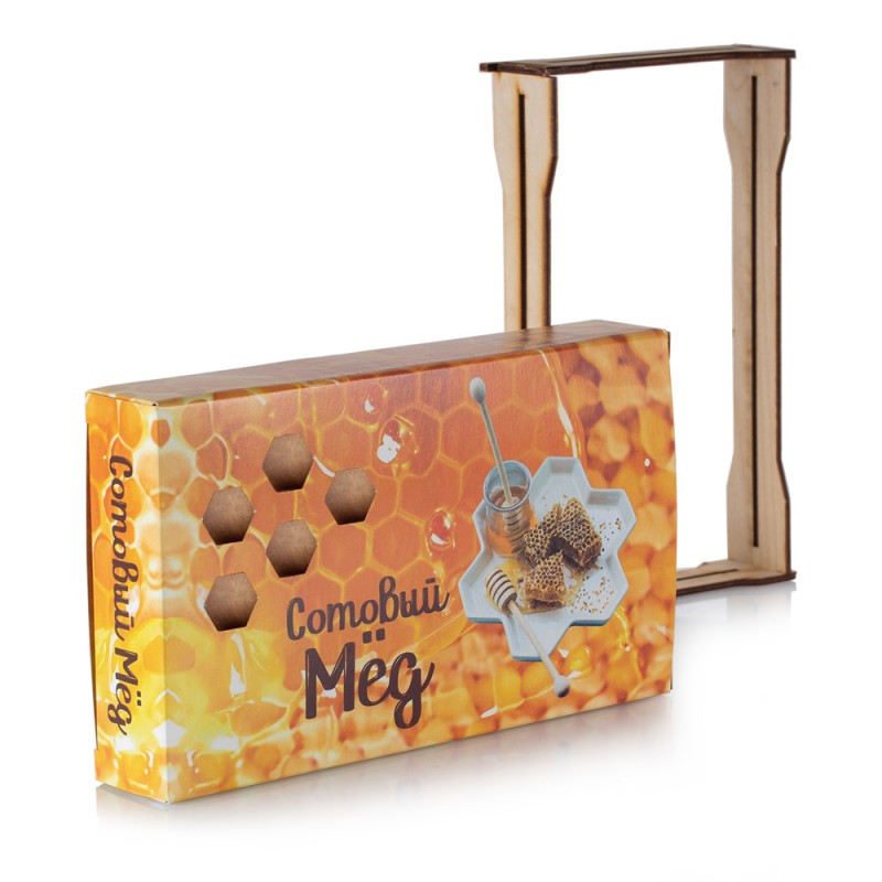 На крышке коробки выполнены небольшие «окошки» в форме пчелиных сот. Эти небольшие «окошки» открывают покупателю возможность, не открывая картонную коробку, посмотреть на сотовый мед. На окошках нет никакой защитной пленки или вставок, поэтому перед тем, как положить сот в коробку, рекомендуем обернуть его стрейчем или упаковать в вакуумный пакет.