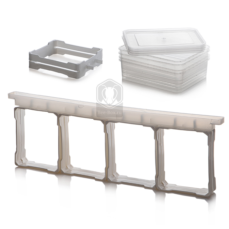Комплект представляет из себя планку (сечением 25х20 мм), четыре медовые минирамки (размеры 120х105 мм) и четыре контейнера для минирамок с медом.