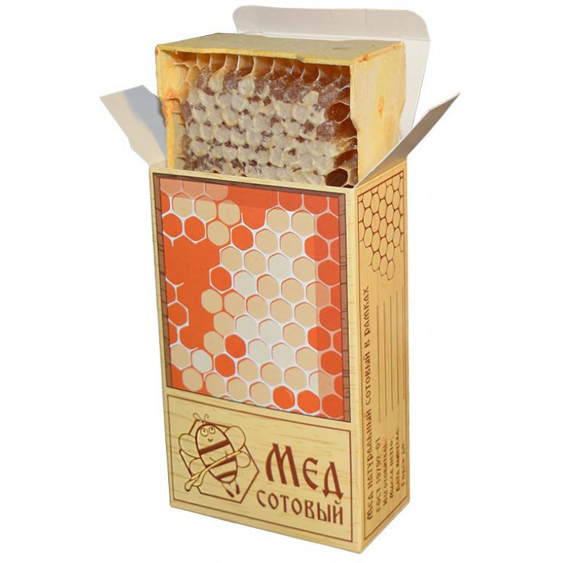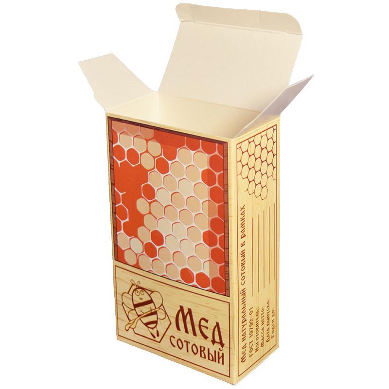 Коробка не имеет открытых окон, что защищает сотовый мед от воздействия солнечных лучей. На коробочках предусмотрено место, куда производитель меда может разместить информацию об изготовителе, массе продукта, сроке годности и т.д.