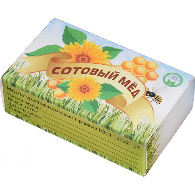 Коробка не имеет открытых окон, что защищает сотовый мед от воздействия солнечных лучей. На коробочках предусмотрено место, куда производитель меда может разместить информацию об изготовителе, массе продукта, сроке годности и т.д.