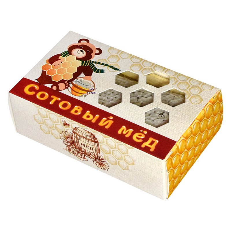 На крышке коробки выполнены небольшие «окошки» в форме пчелиных сот. Эти небольшие «окошки» открывают покупателю возможность, не открывая картонную коробку, посмотреть на сотовый мед. На окошках нет никакой защитной пленки или вставок, поэтому перед тем, как положить сот в коробку, рекомендуем обернуть его стретчем или упаковать в вакуумный пакет.