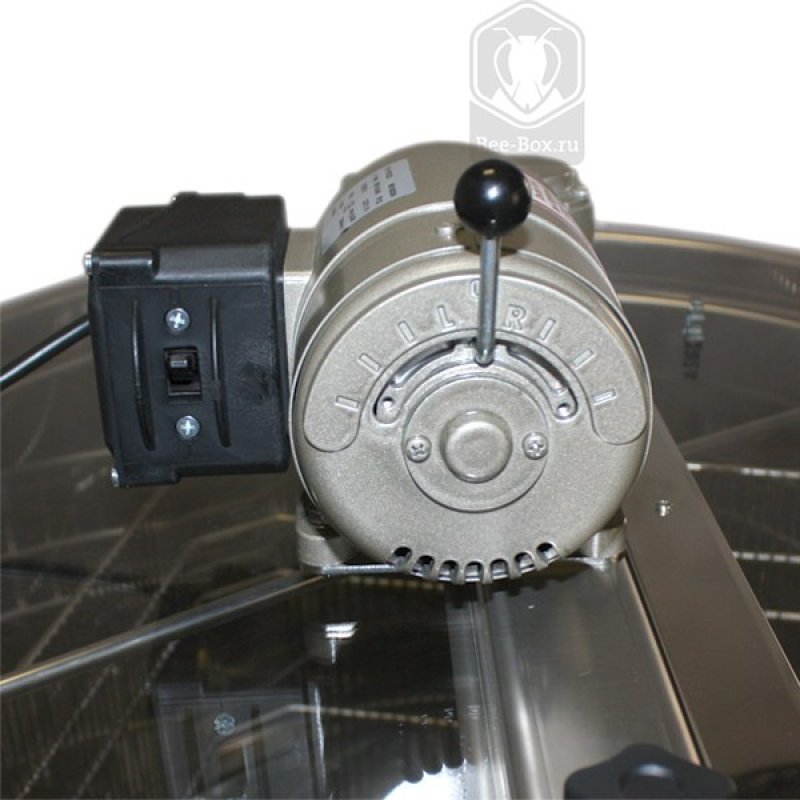 Электродвигатель с верхним расположением имеет плавную регулировку скорости, вращает корзину в обоих направлениях и останавливается в случае открытия крышки медогонки. Мощность двигателя 110 Ватт.