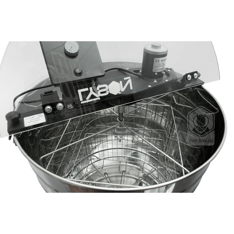 Медогонка 4х рамочная с электроприводом на 230v. Бак выполнен из кислотоустойчивой нержавеющей стали 0,6 мм, диаметр медогонки - 600 мм. Корзна диагональная, универсальная. Крышка сделана из метаплекса и защищает пользователя от контакта с вращающейся корзиной и от загрязнения. Корзина выполнена без центральной оси, что позволяет переворачивать рамки внутри медогонки, не вынимая их наружу. Складные ножки облегчают транспортировку и хранение медогонки.