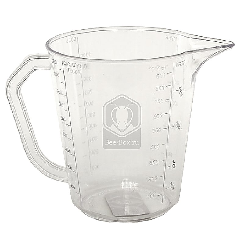 Мерный стакан объёмом 1000 мл, изготовлен из прозрачного пластика. Незаменимая вещь для точной дозировки пчелиной подкормки. Стакан имеет отметки для муки, сахара, воды, соли и мёда.