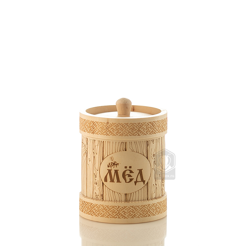 Туесок выполнен из липы, как наиболее подходящего для хранения меда материала. Внутренняя поверхность пропитана натуральным пчелиным воском. Красивая подарочная емкость, идеальная для хранения меда. Высокое качество исполнения.