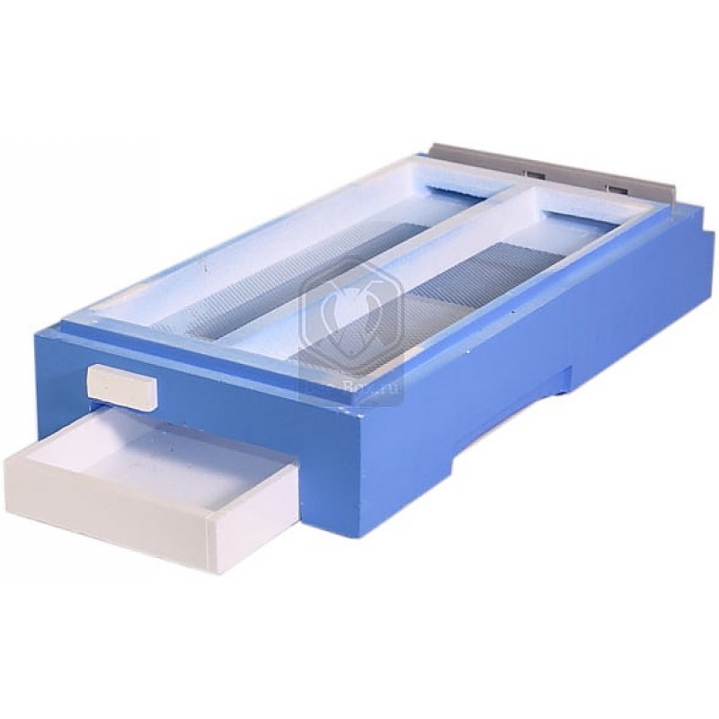 Дно для 6-ти рамочных нуклеусов Лысонь. Имеет возможность для установки перегородки. Спереди есть два летка, которые можно закрывать по-очереди. Один леток с заглушкой с задней стороны улья. Дно покрыто сеткой. Снизу закрывается поддоном.