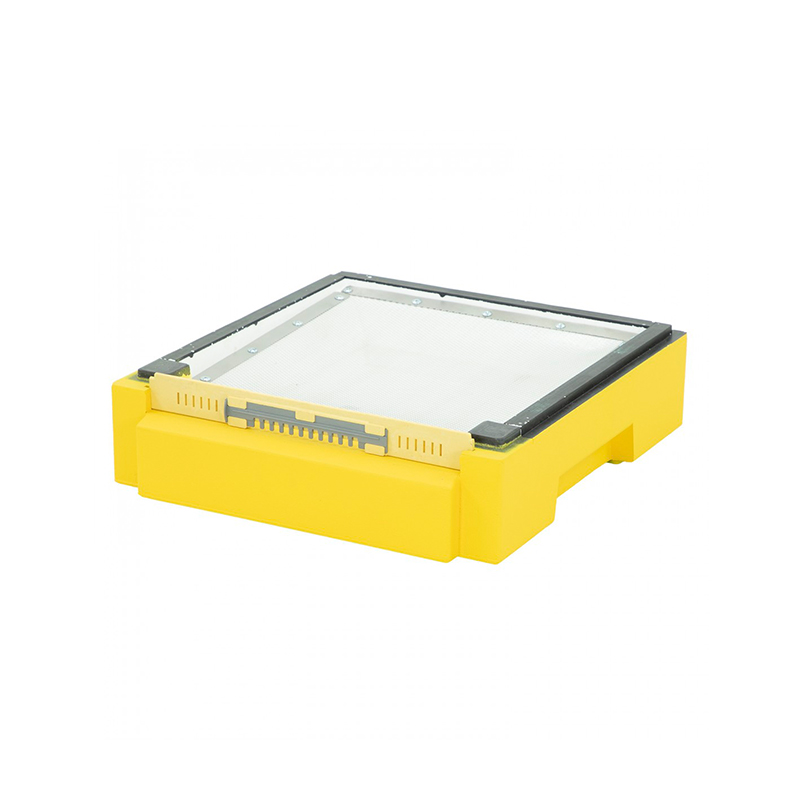 Оно выше стандартного дна на несколько сантиметров. Посередине дно имеет большой проем закрытый сверху противоварроатозной металлической решеткой. Снизу в этот проем вставляется заглушка в форме выдвижного лотка, которая служит для утепления улья, оценки заклещеванности семьи во время обработки и для сбора пыльцы. Между низкой передней частью дна и нижним краем нижнего корпуса образуется широкий основной леток. Летковый заградитель поставляется в комплекте. Снизу дно оборудовано четырьмя пластиковыми ножками, которые, в случае необходимости, позволяют безбоязненно двигать его по плоскости и защищают его при транспортировке. По краям дна имеются удобные ручки для переноски.