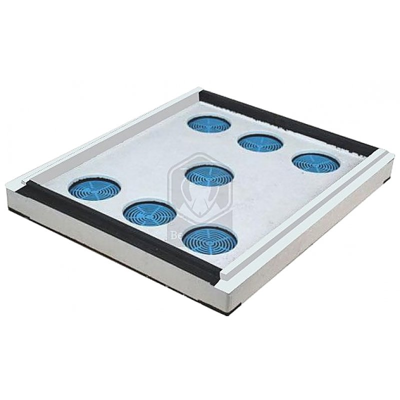 Эта плоская плита с утолщенными краями и семью отверстиями и обычно устанавливается под крышей улья. Перегородка является очень важным элементом улья, т.к. с её помощью осуществляется регулировка вентиляции гнезда. Отверстия перегородки вставляются круглые пластиковые решетки, через которые пчела пройти не может, а регулировка вентиляции осуществляется с помощью глухих пенополистирольных заглушек, закрывая которыми все или часть отверстий можно регулировать вентиляцию улья. Через эти отверстия можно так же осуществлять подкормку пчел из обычных банок. Диаметр отверстия позволяет поставить в него перевернутую банку с сиропом, в крышке которой предварительно надо сделать несколько отверстий. Таким же образом можно давать пчелам воду ранней весной. Если одно из отверстий полностью открыть, то на перегородку можно ставить любые надрамочные кормушки.