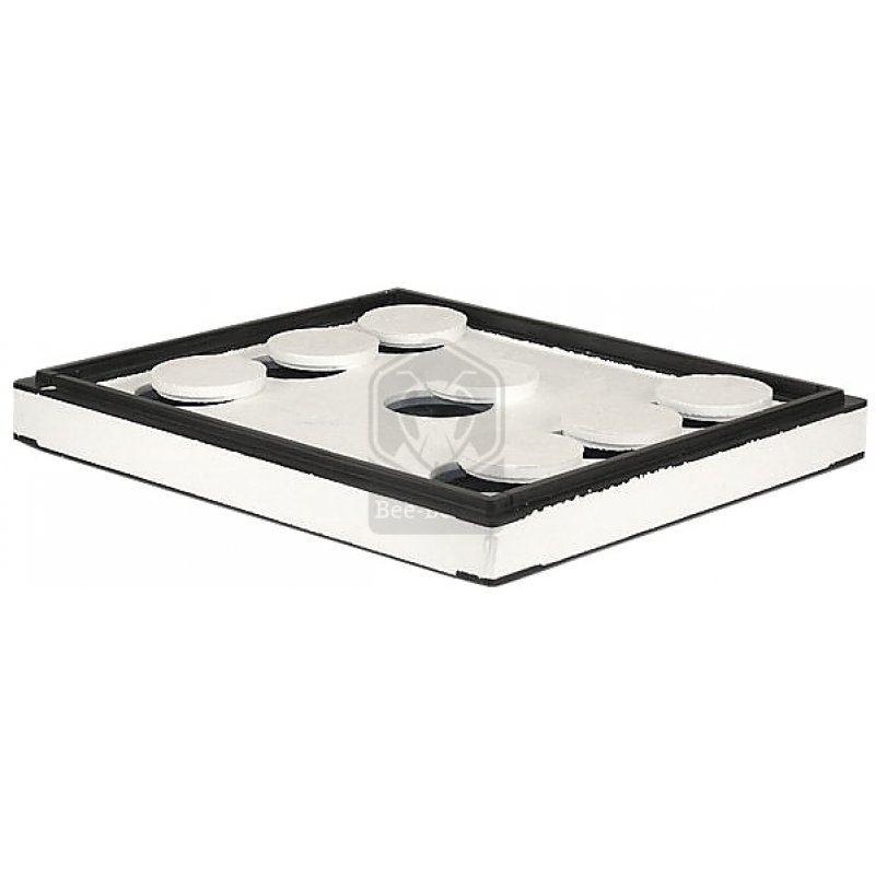 Эта плоская плита с утолщенными краями и семью отверстиями и обычно устанавливается под крышей улья. Перегородка является очень важным элементом улья, т.к. с её помощью осуществляется регулировка вентиляции гнезда. Отверстия перегородки вставляются круглые пластиковые решетки, через которые пчела пройти не может, а регулировка вентиляции осуществляется с помощью глухих пенополистирольных заглушек, закрывая которыми все или часть отверстий можно регулировать вентиляцию улья. Через эти отверстия можно так же осуществлять подкормку пчел из обычных банок. Диаметр отверстия позволяет поставить в него перевернутую банку с сиропом, в крышке которой предварительно надо сделать несколько отверстий. Таким же образом можно давать пчелам воду ранней весной. Если одно из отверстий полностью открыть, то на перегородку можно ставить любые надрамочные кормушки.