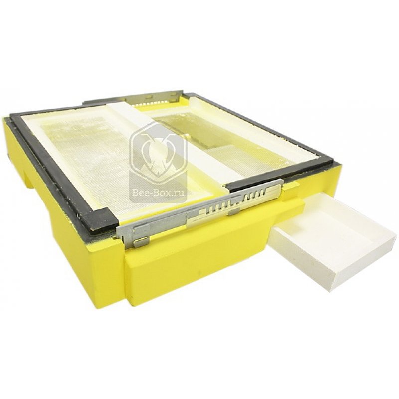 Сложное дно для 12-ти рамочного улья. Имеет два летка направленные в противоположные стороны, открытое дно с противоварроатозной сеткой, поделенное на две части жесткой перегородкой и закрывающееся двумя лотками-заглушками. Летковые заградители идет в комплекте, и они регулируемые. По всему периметру дна установлены пластиковые фальцы. Пластиком же усилены места, где летковый заградитель входит в дно. Перед летком сделан небольшой отлив, выполняющий функцию прилетной доски. По краям дна имеются удобные ручки для переноски.
