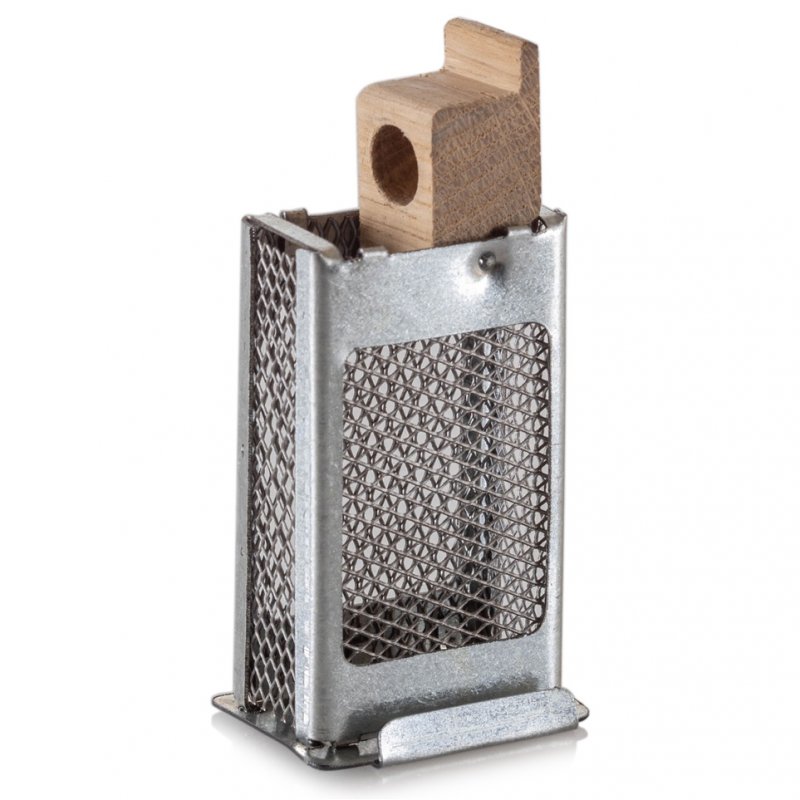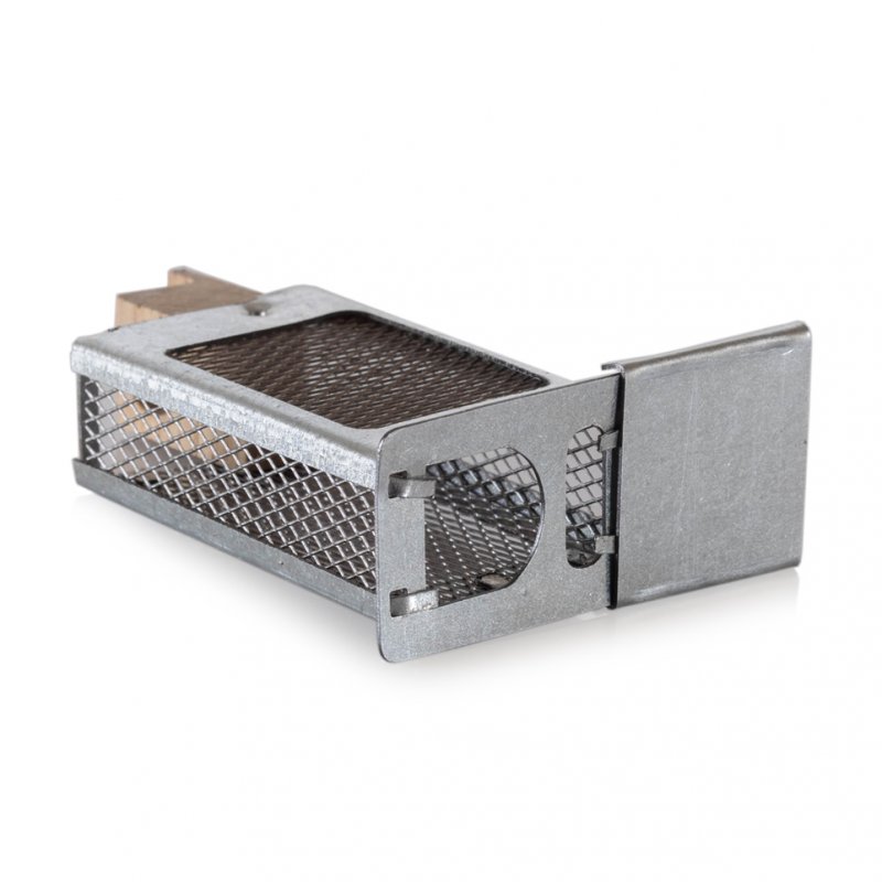 С другой стороны клеточки есть деревянная дверца с отделением для канди. Оно используется для транспортировки маток на большие расстояния. В этом случае матка помещается в клеточку вместе с нескольими пчелами-кормилицами.