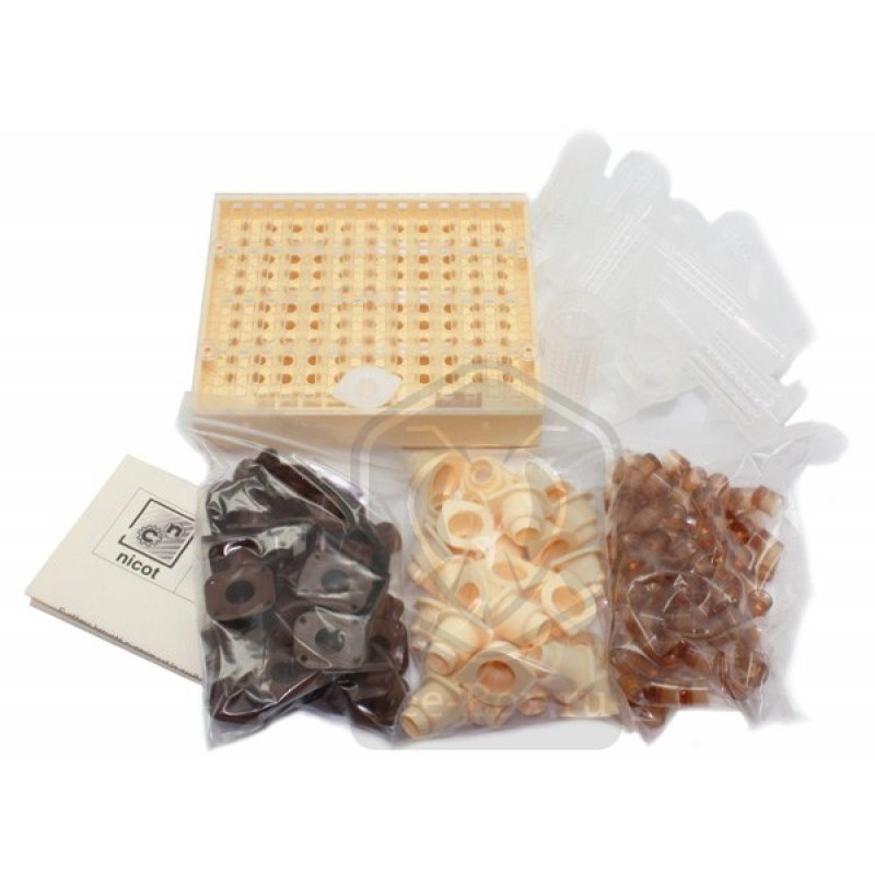 Инструкция по применению: На поверхность кассеты (лицевая сторона) нанести кисточкой тонкий слой жидкого воска или меда. Чтобы воск хорошо наносился и держался на поверхности надо проводить все работы в теплой комнате и весь инвентарь должен быть комнатной температуры. На задней стороне закрепить 100 искусственных мисочек. На рамке с расплодом, желательно из середины пчелиного гнезда, вырезается место под кассету. Кассета крепится к верхней планке рамки двумя маленькими шурупами. Закрепить разделительную решетку на кассету и через отверстие в ней запустить матку, желательно вечером. Закрыть отверстие пластмассовой пробкой. Обратите внимание на то, чтобы искусственные соты кассеты были доступны рабочей пчеле. В течение нескольких часов матка откладывает яйца в искусственные ячейки. В сезон весной и в первой половине лета - матка откладывает яйца на кассете и без принуждения, то есть без разделительной решетки (для большей продуктивности за 10 дней до этого можно семью подкормить). Через 3 дня появляются личинки.