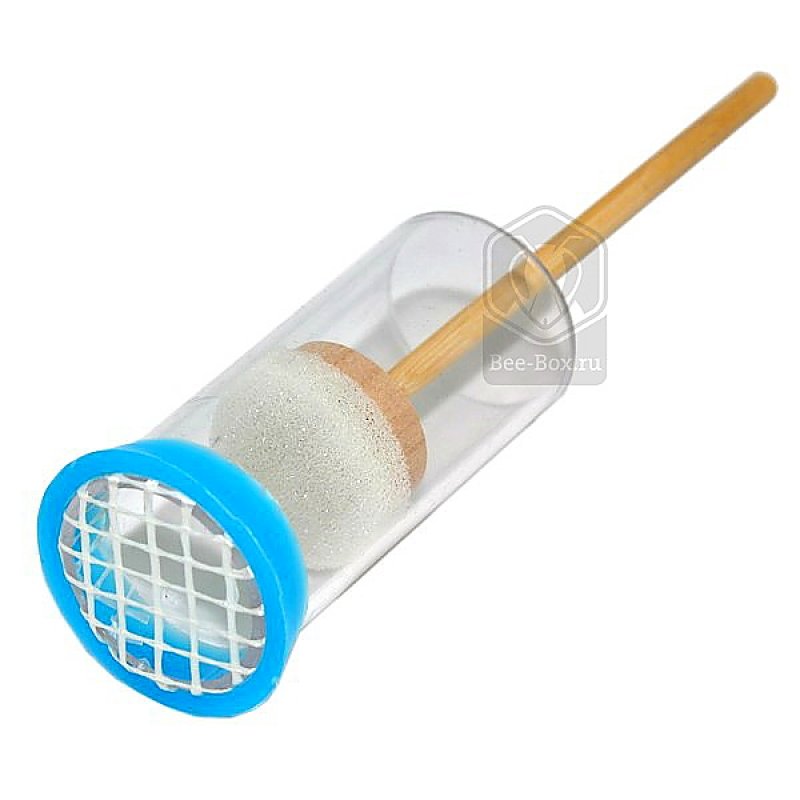 Поршень состоит из двух компонентов: колбы из прозрачного пластика, закрытой с одной стороны сеткой, и деревянного поршня с поролоновой подушечкой, чтобы не повредить пчелиную матку.